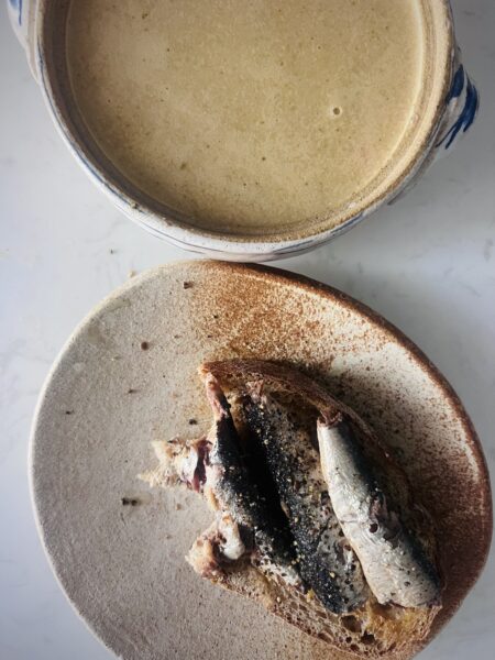 Blended veggie soup with coconut milk + chickpeas, sourdough toast with sardines (packed in olive oil) salt/pepper