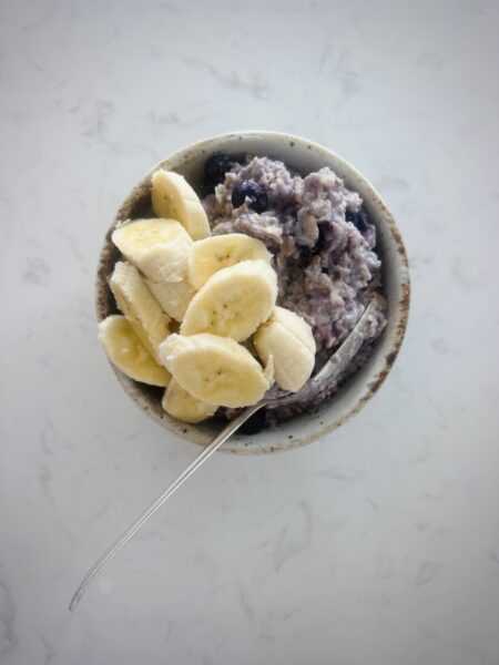 Oatmeal + vanilla whey protein, 1 tbsp chia seed, 1/2 cup blueberries, 1/2 banana