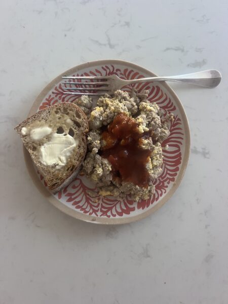Whole wheat sourdough toast + butter, ground turkey & eggs + ghost pepper salsa