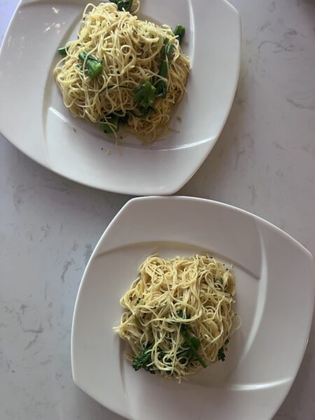 angel hair pasta + olive oil, garlic, chili & Italian seasoning with broccoli raab and parmesan