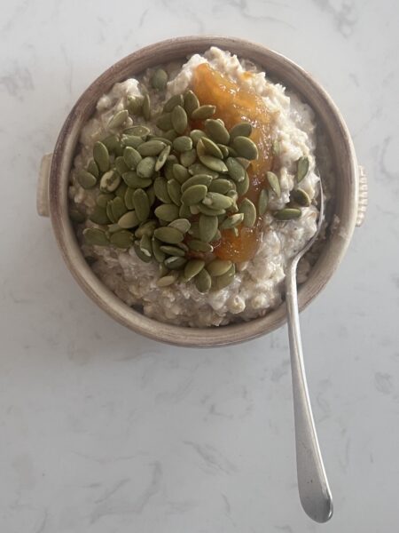 oats + vanilla whey protein, orange marmalade, pumpkin seeds