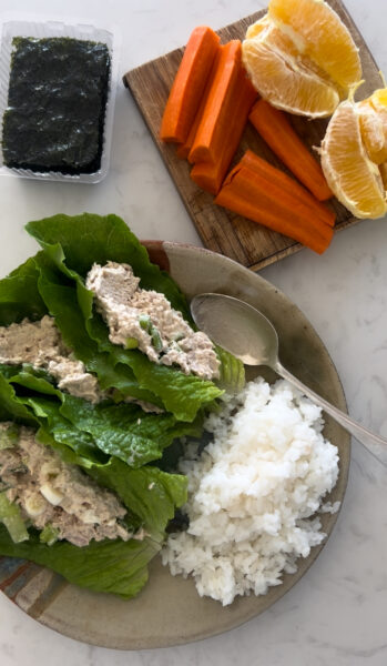 Lettuce wraps + tuna salad with scallion, leftover white rice & seaweed + carrots (peanut butter on the side) & an orange