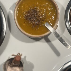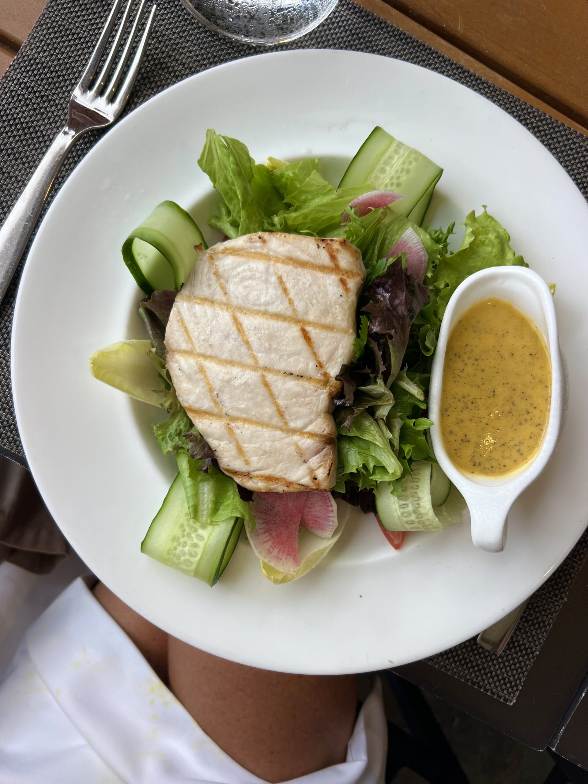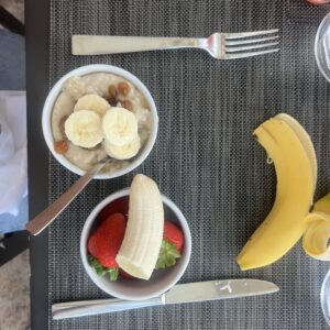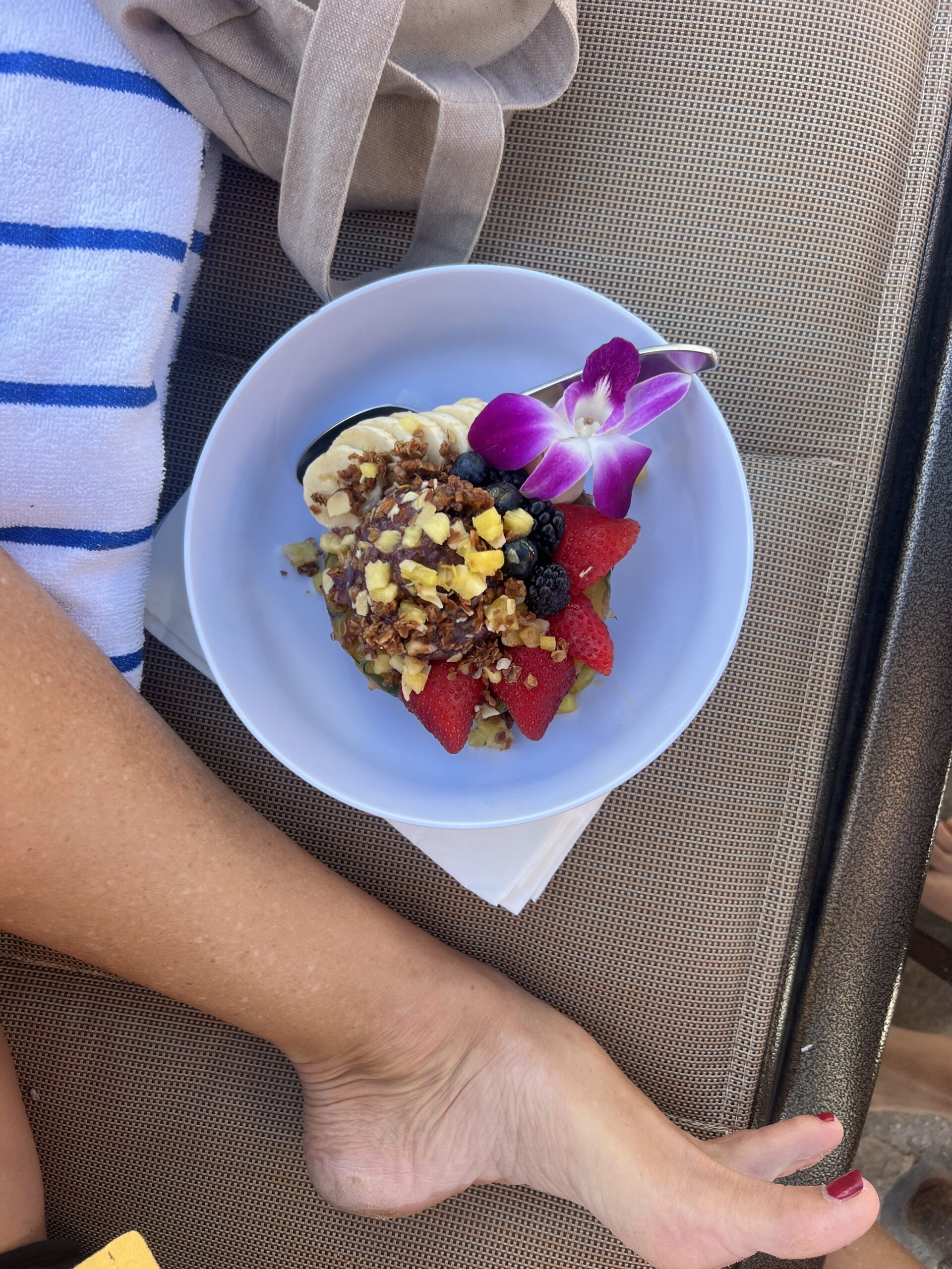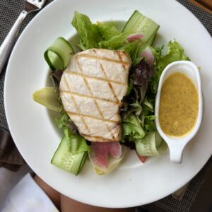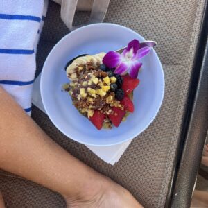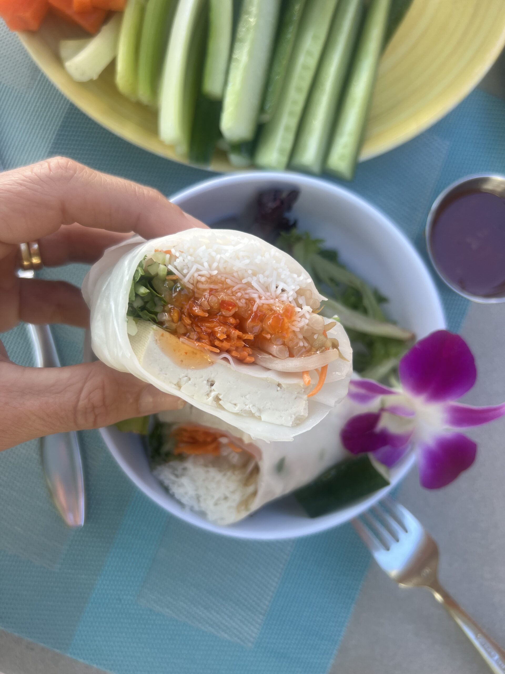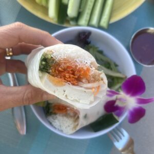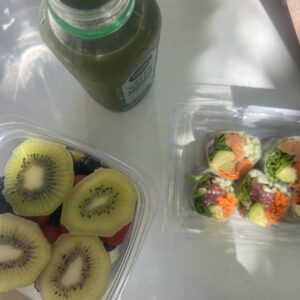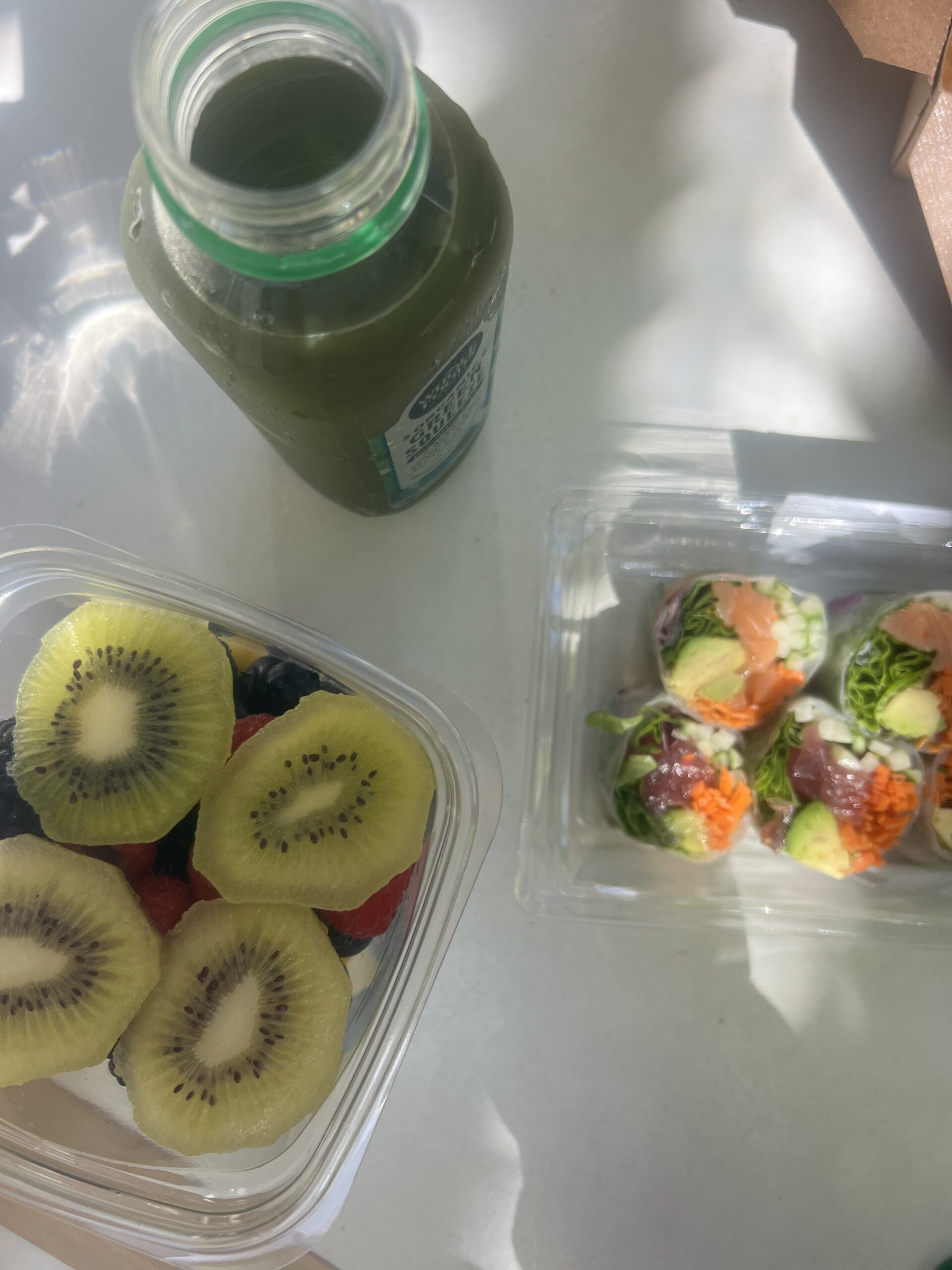 - fresh food – raw fish summer rolls, fruit salad + green drink