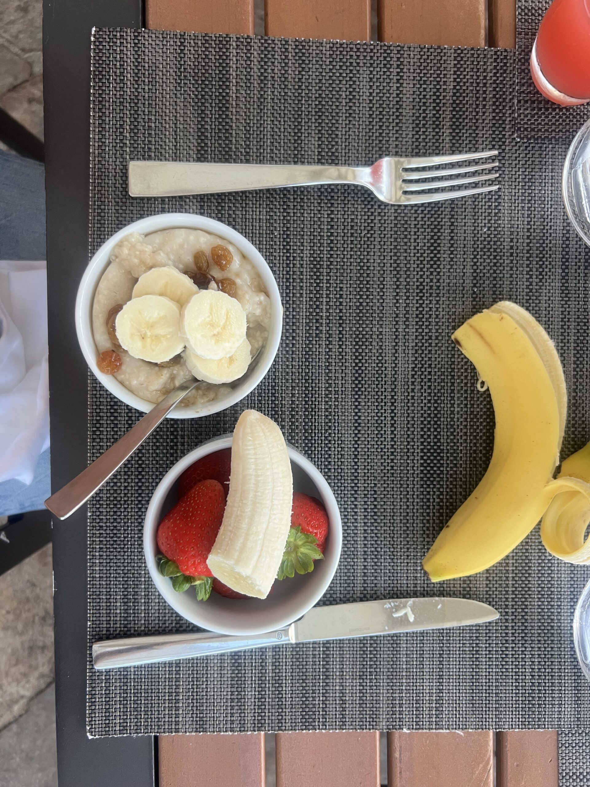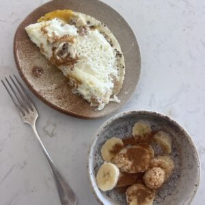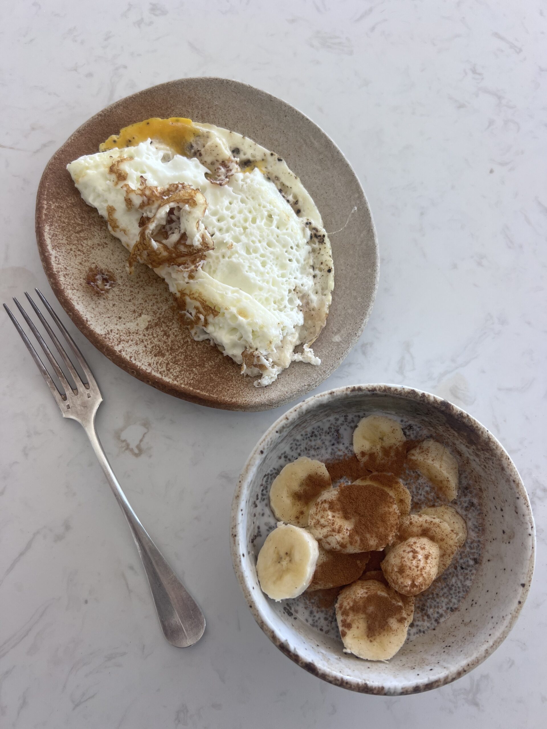 - egg + egg white & pecorino omelet. Chia pudding with banana and blueberries