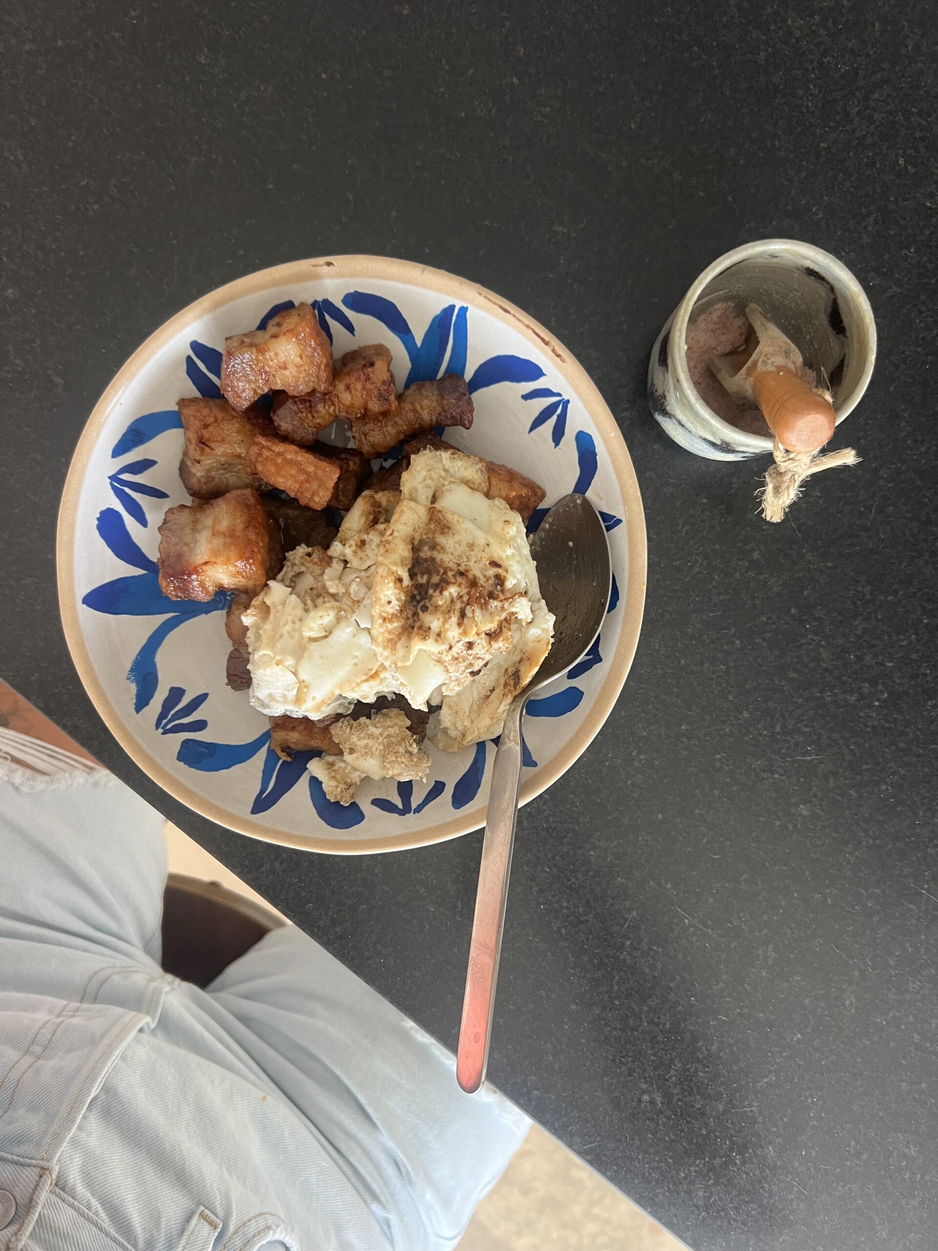 - pork belly & leftover egg whites cooked in rendered animal fat